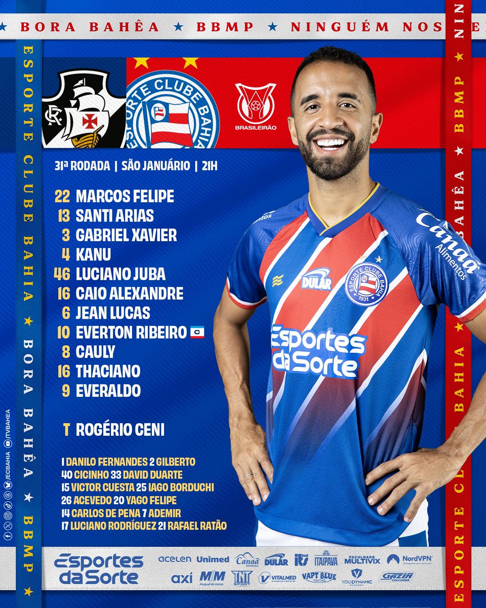 28/10/24 - Bahia divulga relacionados para o jogo contra o Vasco; veja