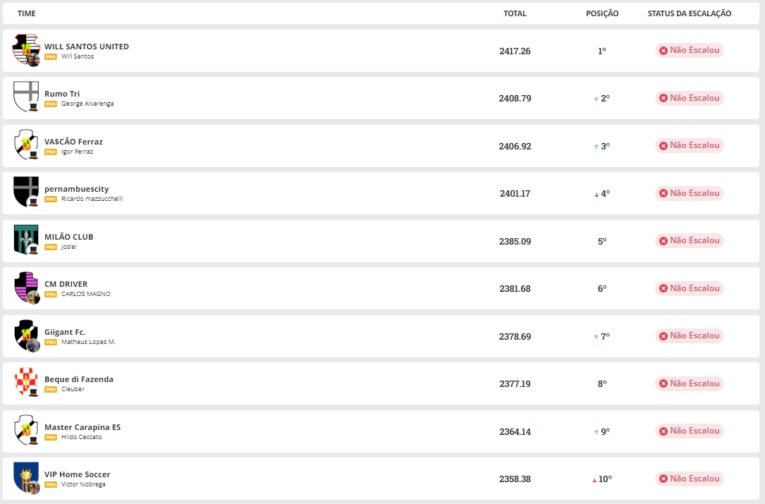 23/09/24 - Cartola: Confira a classificação da Liga NETVASCO após a 27ª rodada