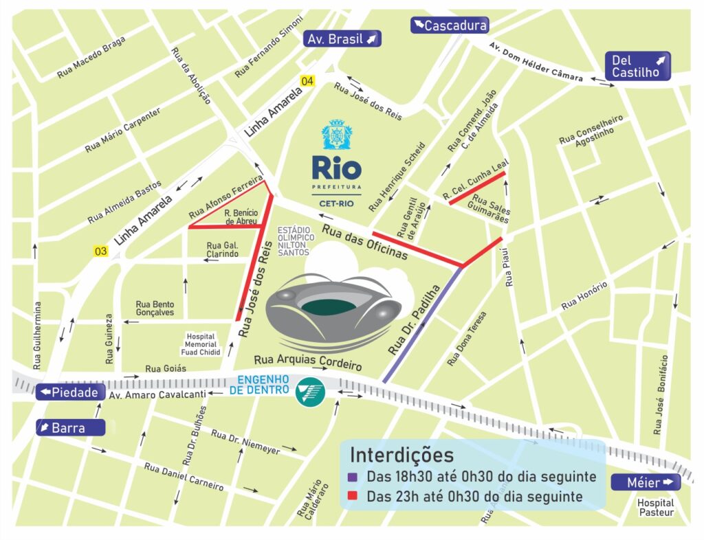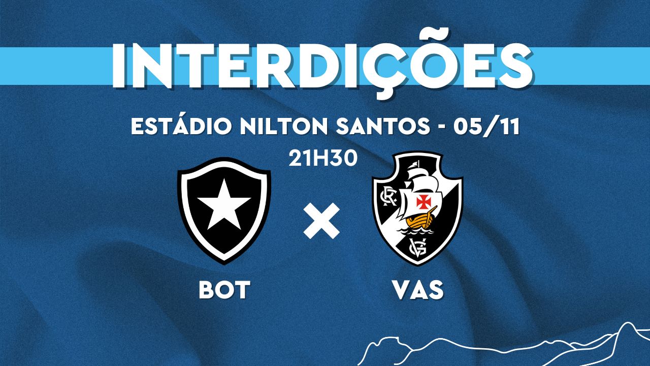 O Centro de Operações do Rio, por meio da CET-Rio, informa que haverá operação de trânsito, nesta terça-feira (05/11), para o jogo entre Botafogo e Vasco pelo Campeonato Brasileiro, às 21h30, no estádio Nilton Santos, no Engenho de Dentro. A partir das 18h30, haverá interdição ao trânsito de veículos na região onde acontece a partida.