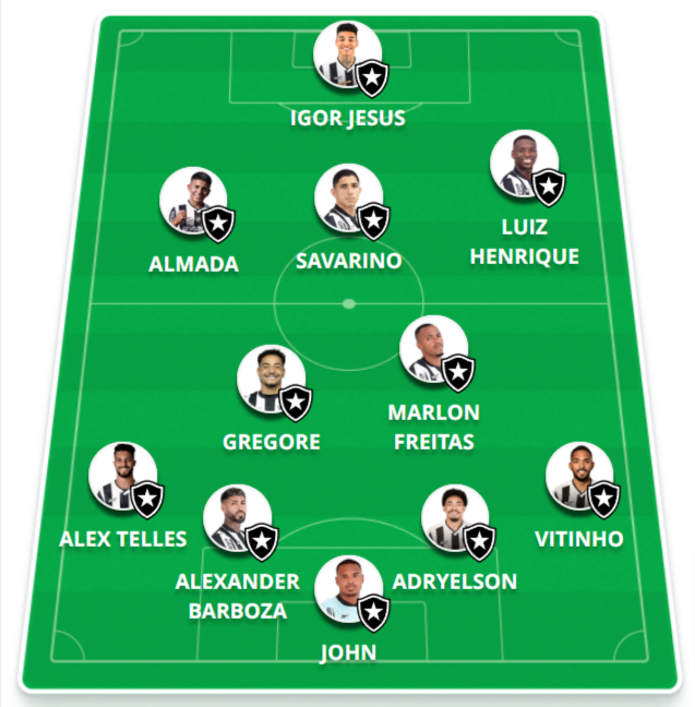 Provável Botafogo: John; Vitinho, Adryelson, Barboza e Alex Telles; Gregore e Marlon Freitas; Luiz Henrique, Savarino e Thiago Almada; Igor Jesus.