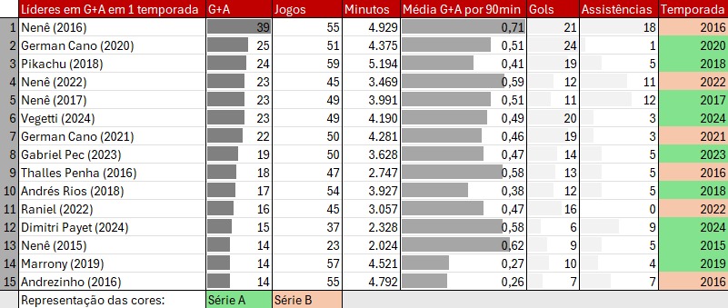 📊 Jogadores do Vasco com mais participações em gol em uma temporada nos últimos 10 anos (2015-2024).