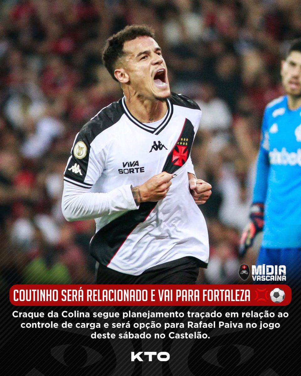 Philippe Coutinho viaja para Fortaleza. Após ter ficado de fora das partidas contra Bahia e Botafogo, o jogador volta a ser relacionado. O Vasco embarca hoje para Fortaleza e treina amanhã no CT do Ceará.