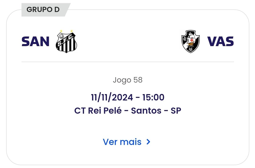 A CBF divulgou no seu site os confrontos pelas quartas de final do Campeonato Brasileiro Sub-23 (Aspirantes). O Vasco vai jogar a partida única contra o Santos, no CT Rei Pelé, na próxima segunda-feira (11/11), às 15h. Se for empate, decisão nos pênaltis.