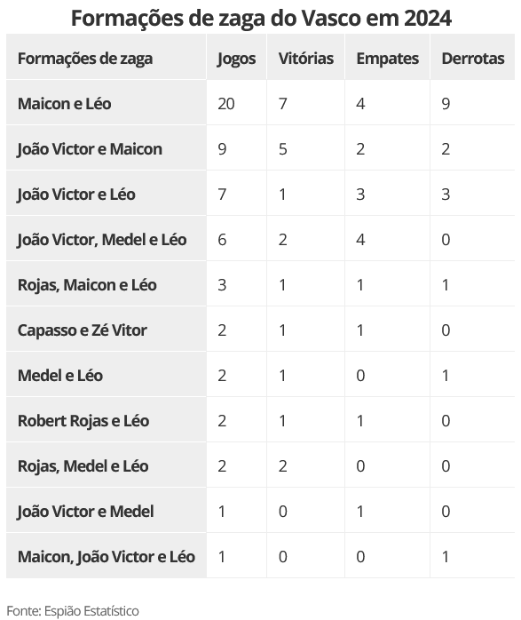 Ao todo, o Vasco escalou onze formações de zaga diferentes ao longo do ano, entre duplas e trios de defesa. João Victor e Maicon aparecem como a segunda formação titular mais utilizada em 2024, com nove jogos.
