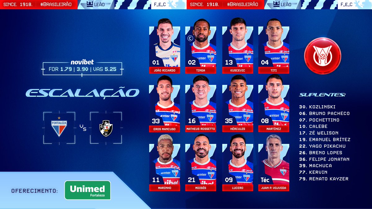 Veja a escalação do Fortaleza para o jogo contra o Vasco; ex-vascaíno Titi é titular e Yago Pikachu e Renato Kayzer ficam no banco