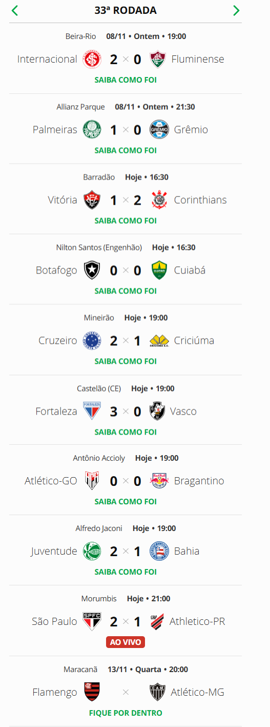 Terminados os jogos deste sábado da 33ª rodada do Campeonato Brasileiro, o Vasco, que perdeu para o Fortaleza no Castelão, segue na 9ª colocação.