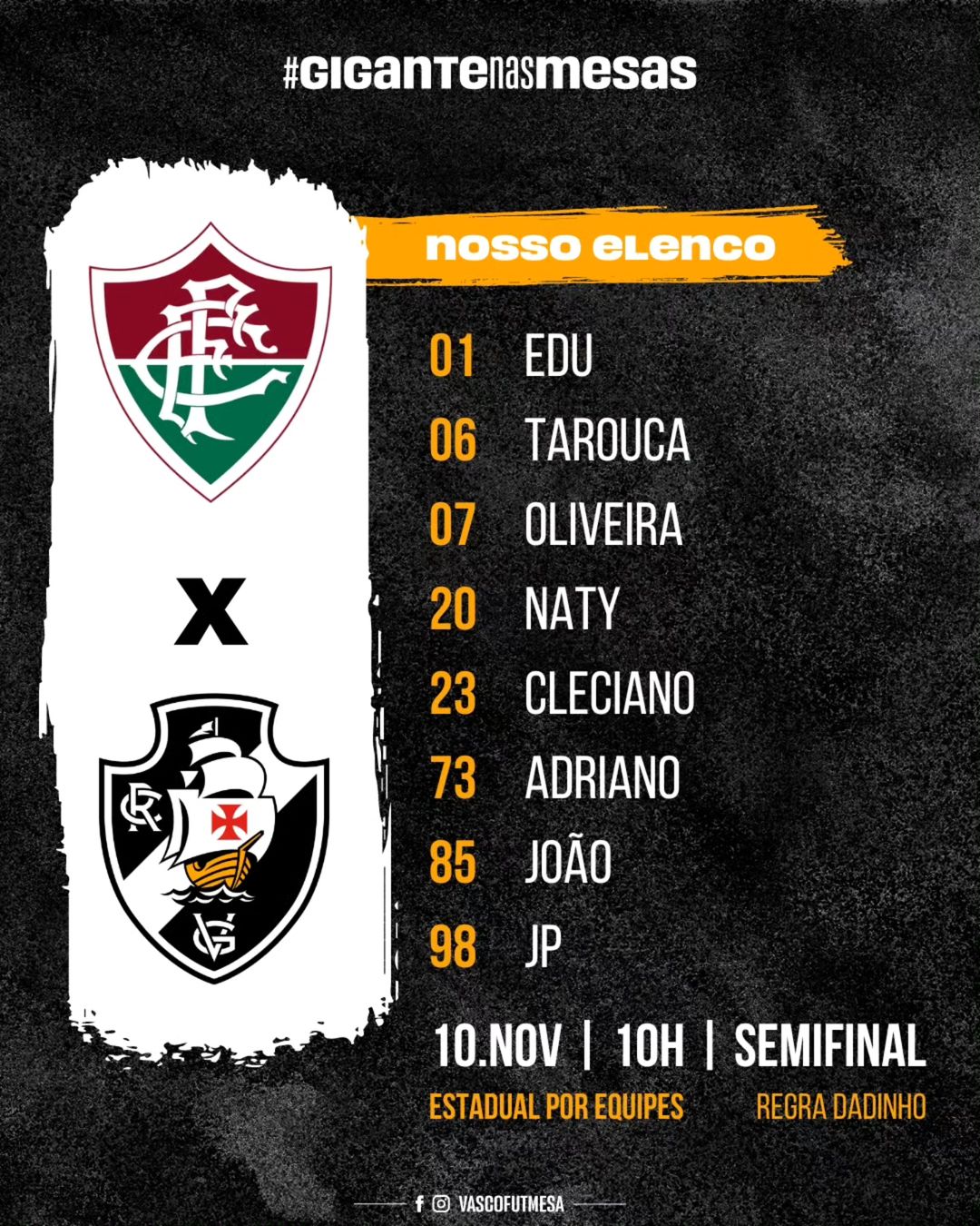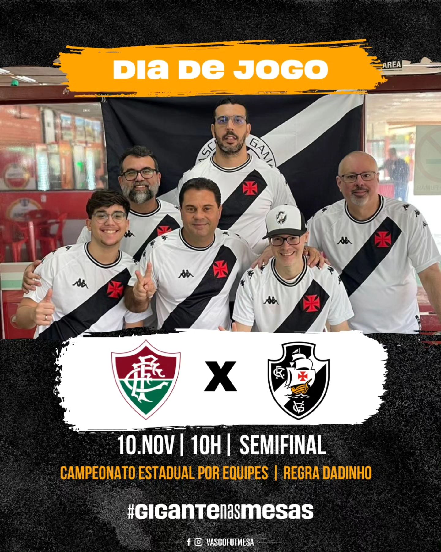 Em busca da classificação para a final do Campeonato Estadual por equipes da Regra Dadinho, o time vascaíno enfrenta o Fluminense, nas Laranjeiras, neste domingo (10/10), às 10h.