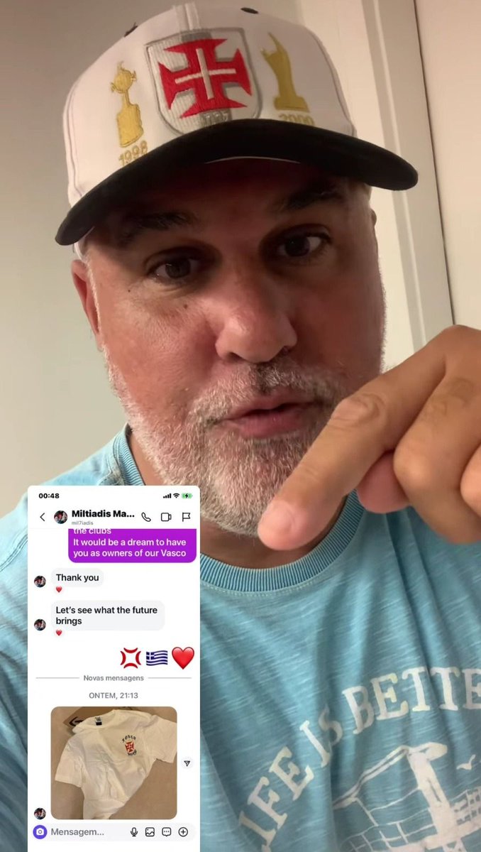 O influenciador 'Zé Colméia' recebeu uma mensagem do filho do magnata grego Evangelos Marinakis onde ele mostra uma camisa da Força Jovem.