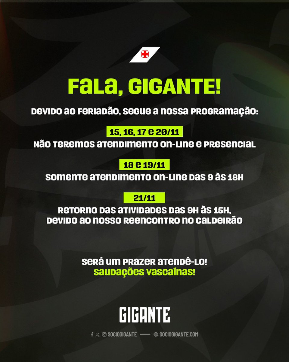 Confira o horário de atendimento do Sócio Gigante durante os próximos dias ⚠️