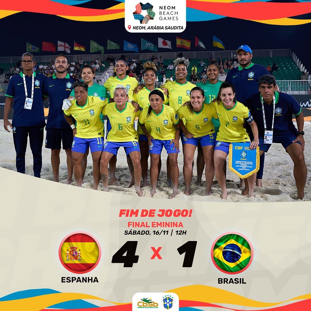 A seleção brasileira feminina de beach soccer foi derrotada pela Espanha na final do NEOM Beach Games 2024, neste sábado (16), por 4 a 1, e ficou com o vice-campeonato do torneio. 🥈👏👏👏