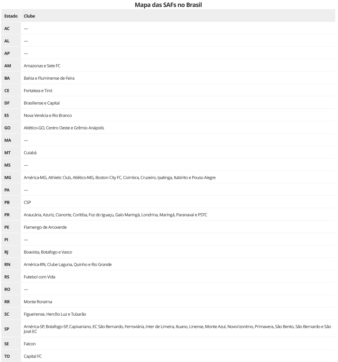 Por outro lado, há ainda oito estados que seguem sem nenhum clube no formato SAF: Acre, Alagoas, Amapá, Maranhão, Mato Grosso do Sul, Pará, Piauí e Roraima. Esses estados, até o momento, não apresentam registros de clubes que adotaram o modelo de sociedade anônima.