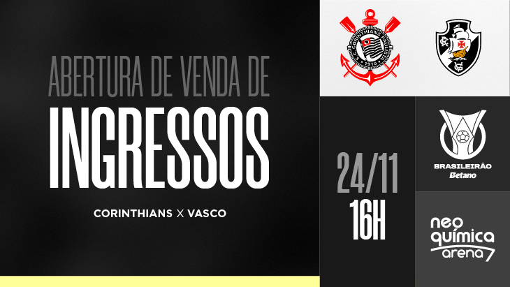 O Sport Club Corinthians Paulista anuncia como se dará a venda de ingressos e a recepção do público na Neo Química Arena para a partida entre Corinthians x Vasco (em 24/11, às 16h), em confronto válido pela 35ª rodada do Brasileirão 2024.
