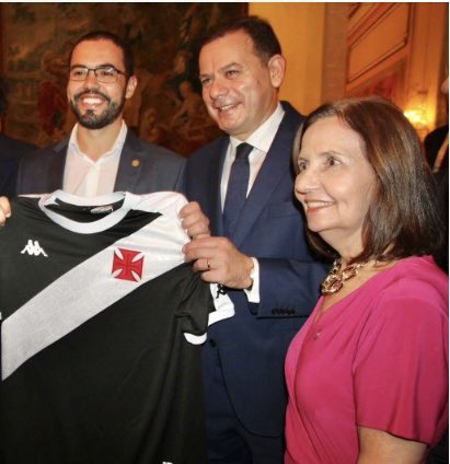 Ontem (19/11), o Vasco da Gama ganhou destaque internacional em uma noite histórica no Consulado Português no Rio! Durante um coquetel com o primeiro-ministro de Portugal, Luiz Montenegro, o grito de guerra ‘Casaca' tomou conta do evento. A camisa oficial do Gigante da Colina, personalizada com o nome do premiê, foi entregue pelo vereador Pedro Duarte (Novo), em um momento emocionante liderado pela cônsul-geral Gabriela Soares de Albergaria.