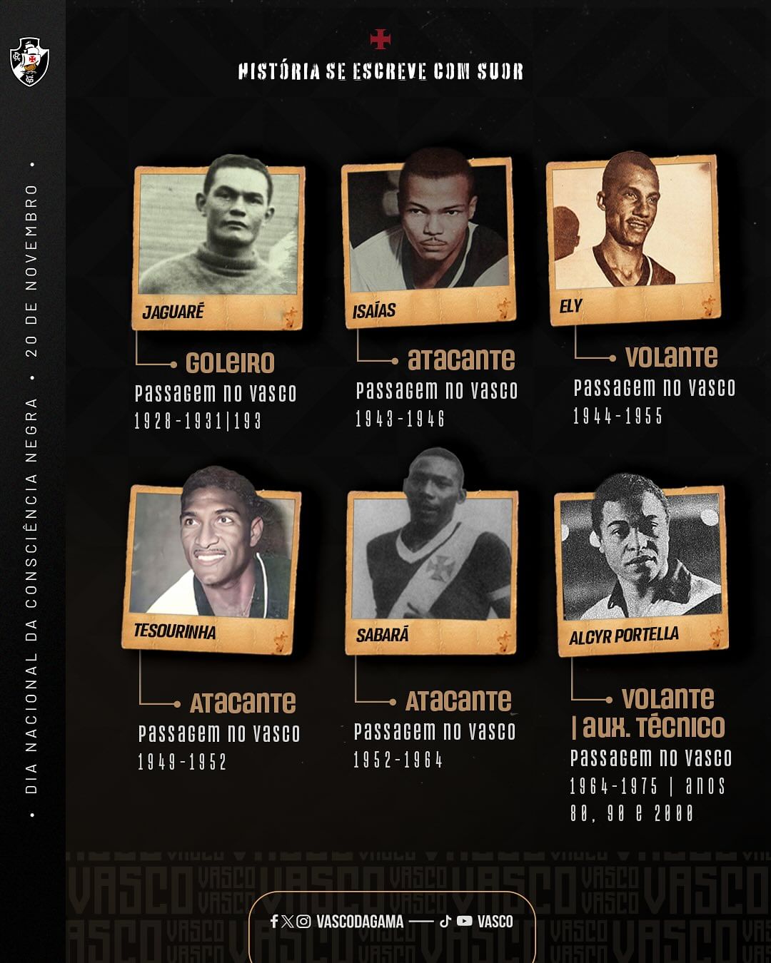 No Dia da Consciência Negra, Vasco homenageia personalidades vascaínas do esporte; veja postagem
