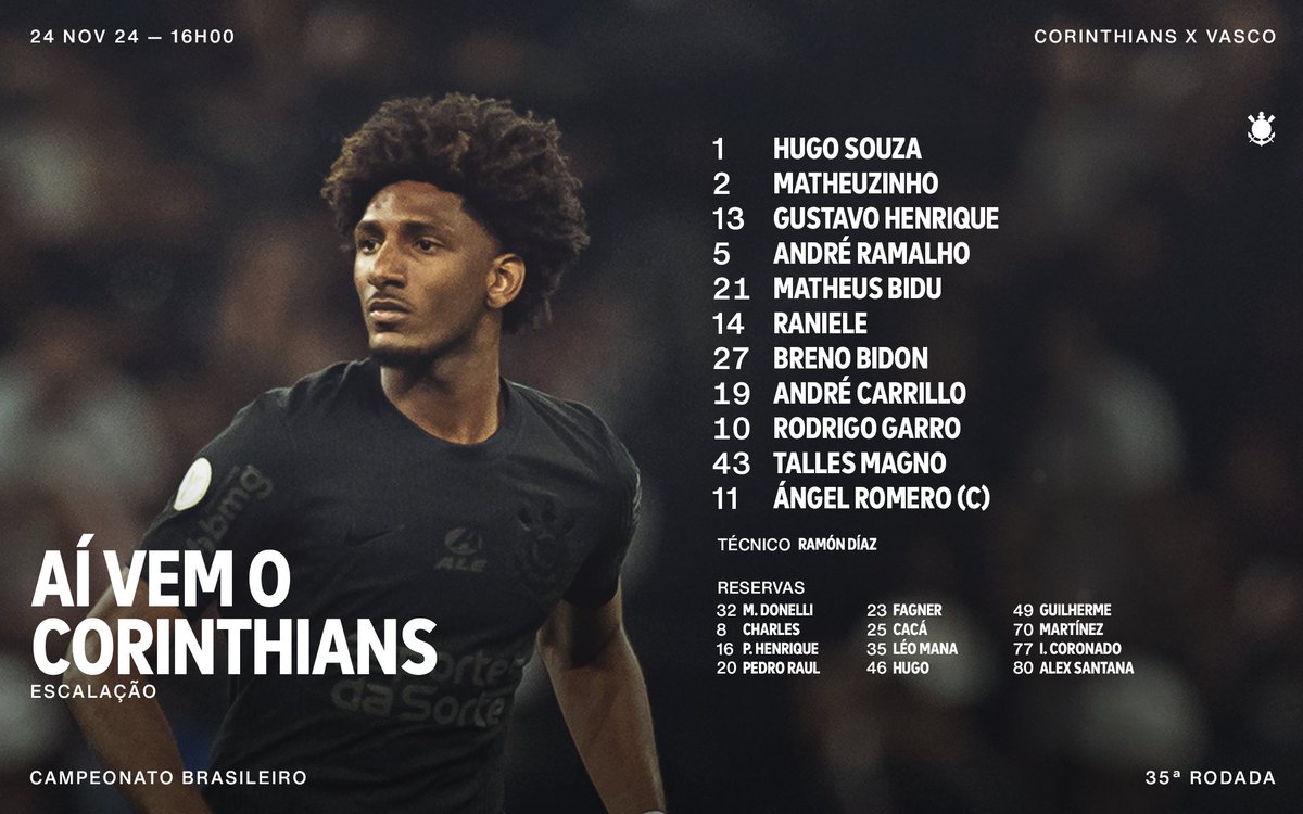 Veja a escalação do Corinthians para o jogo contra o Vasco; cria vascaíno Talles Magno é titular