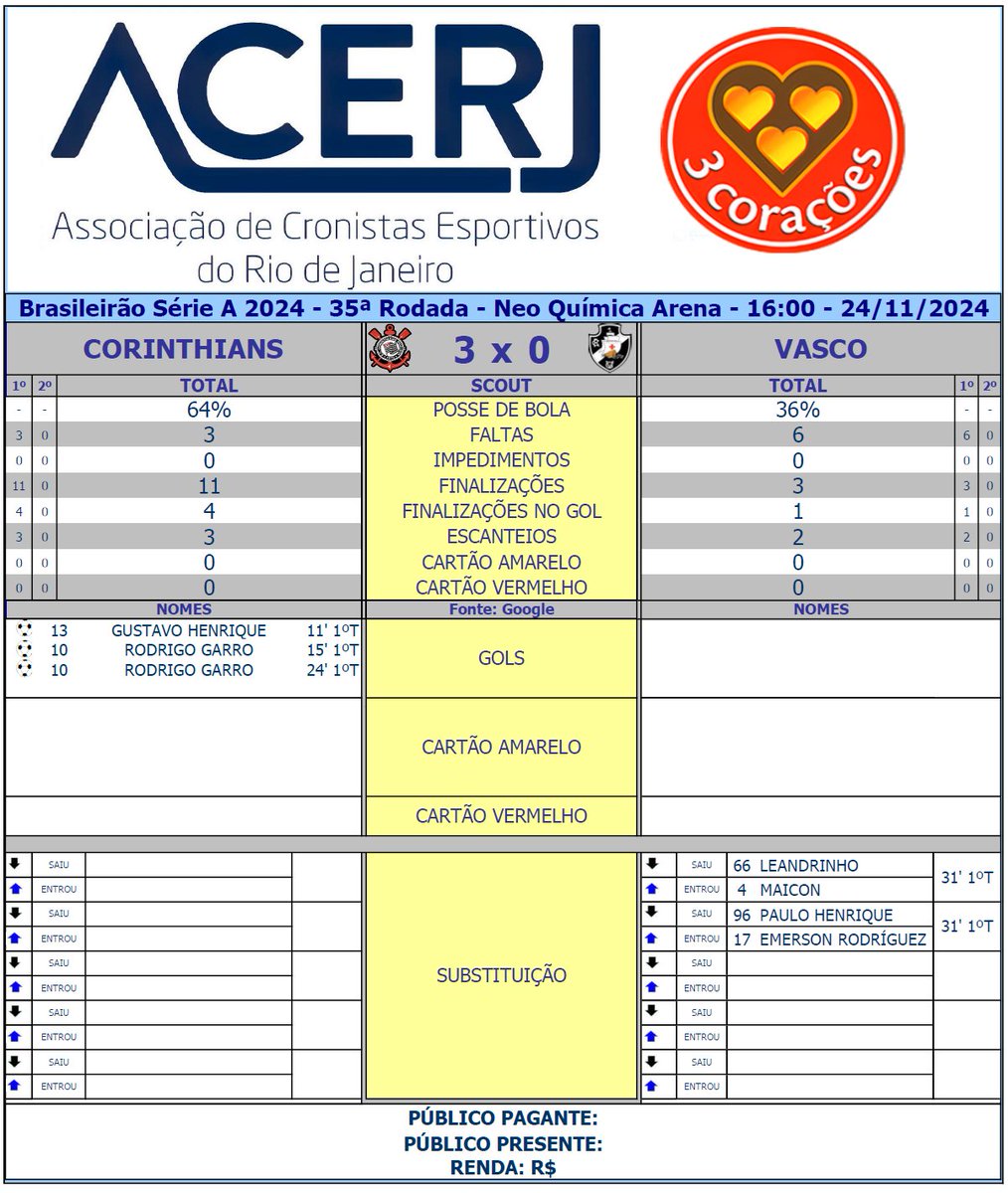 Scout do 1º Tempo de Corinthians e Vasco pela 35ª Rodada do Campeonato Brasileiro 2024 na Neo Química Arena (Fonte: Google) #Acerjinforma #brasileirao2024 #SCCPxVAS #Corinthians #Vasco @Brasileirao @Corinthians @VascodaGama