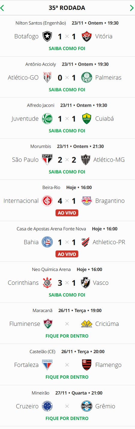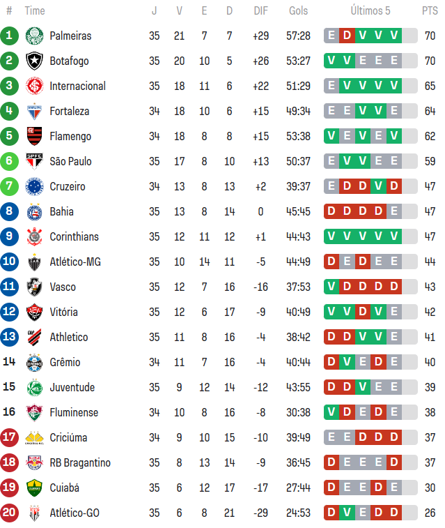 Terminados os jogos deste domingo da 35ª rodada do Campeonato Brasileiro, o Vasco, que perdeu para o Corinthians em São Paulo, está na 11ª colocação.