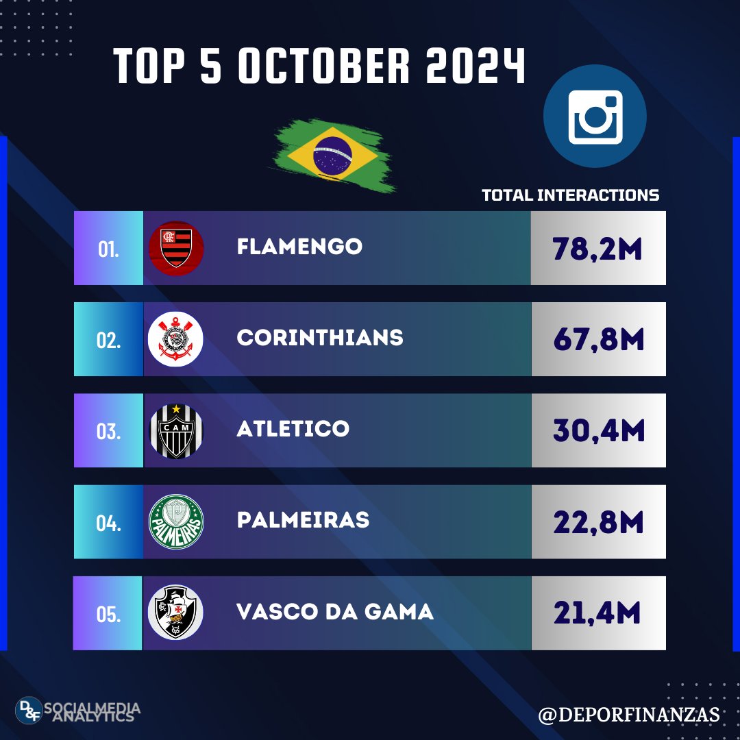 📲🇧🇷⚽ Os 5 clubes brasileiros com mais engajamento no #instagram durante outubro 2024!