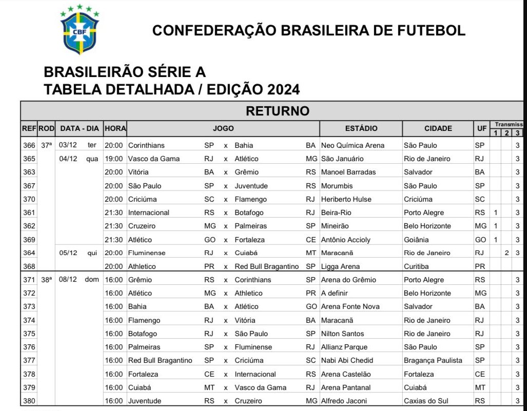 CBF Divulga a tabela das rodadas 37 e 38 do Brasileirao 2024.