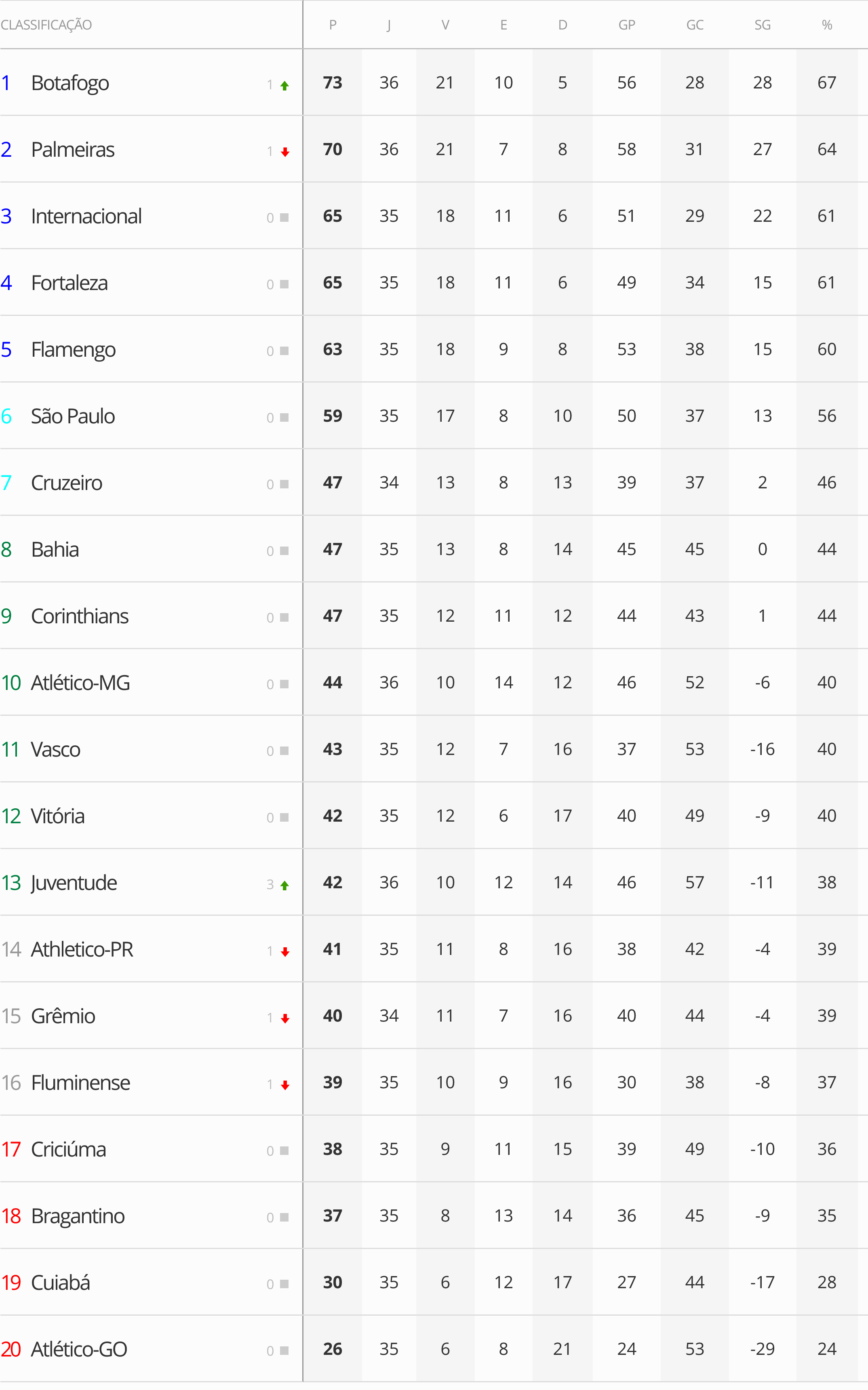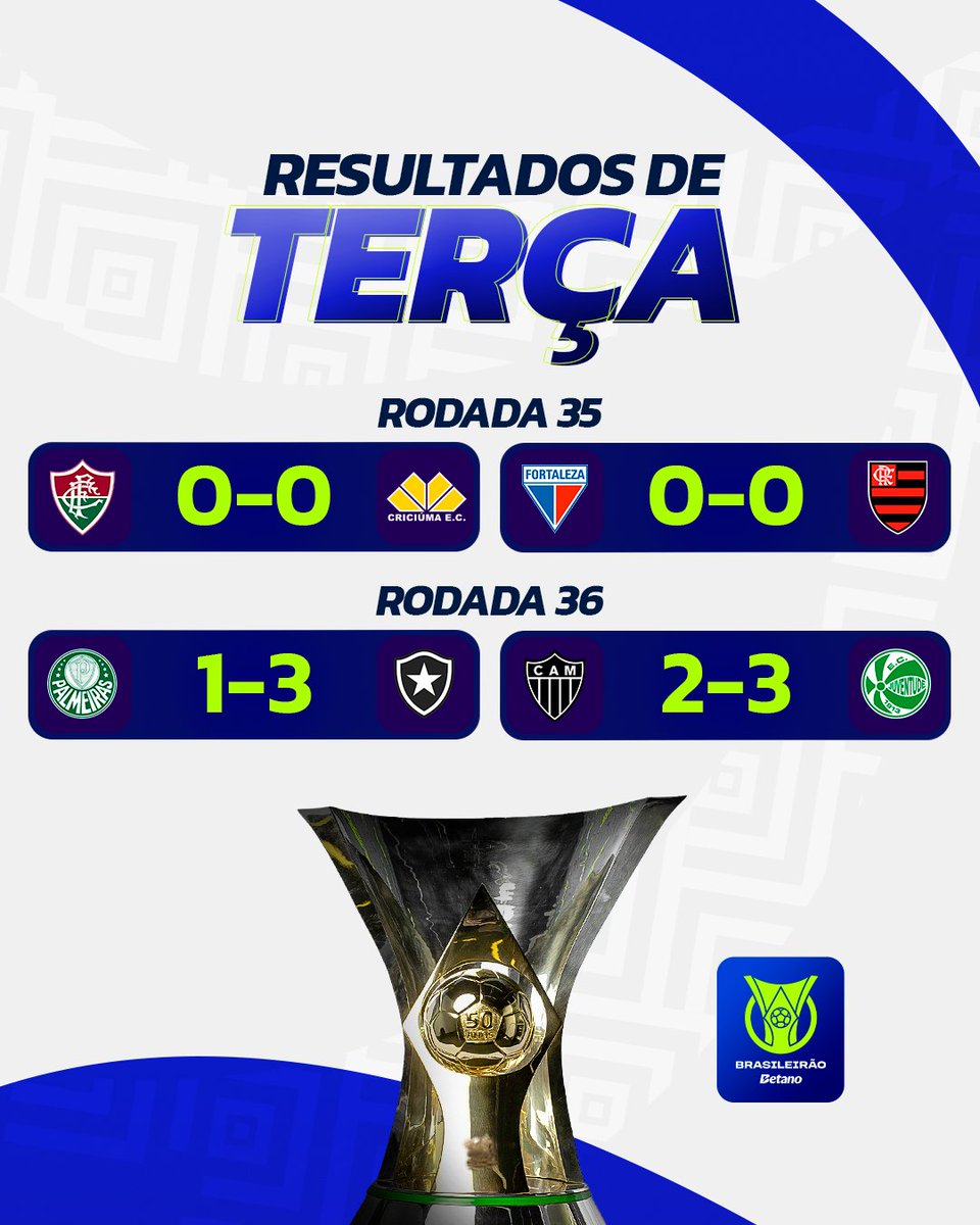 Quatro jogos foram disputados nesta terça-feira pelo Campeonato Brasileiro: dois pela rodada 35 (Fluminense 0 x 0 Criciúma e Fortaleza 0 x 0 Flamengo) e dois pela rodada 36 (Palmeiras 1 x 3 Botafogo e Atlético-MG 2 x 3 Juventude).