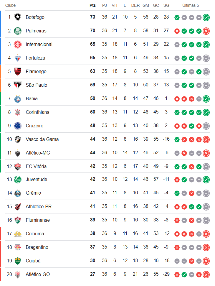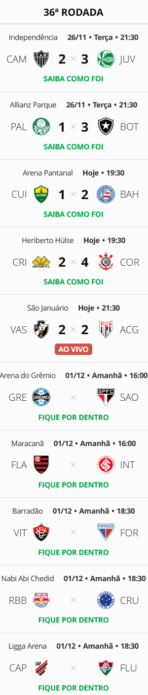 Vasco está na 10ª colocação após os jogos de sábado da 36ª rodada do Brasileiro