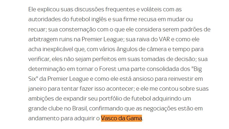 Ele explicou suas discussões frequentes e voláteis com as autoridades do futebol inglês e sua firme recusa em mudar ou recuar; sua consternação com o que ele considera serem padrões de arbitragem ruins na Premier League; sua raiva do VAR e como ele acha inexplicável que, com vários ângulos de câmera e tempo para verificar, eles não sejam perfeitos em suas tomadas de decisão; sua determinação em tornar o Forest uma parte consolidada dos "Big Six" da Premier League e como ele está ansioso para reinvestir em janeiro para tentar fazer isso acontecer; e ele me contou sobre suas ambições de expandir seu portfólio de futebol adquirindo um grande clube no Brasil, confirmando que as negociações estão em andamento para adquirir o Vasco da Gama.