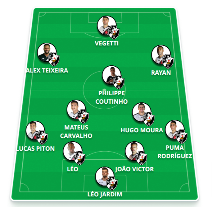 Provável escalação do Vasco: Léo Jardim, Puma, João Victor, Léo, Lucas Piton, Hugo Moura, Mateus Carvalho, Coutinho, Alex Teixeira, Rayan (Maxime) e Vegetti.