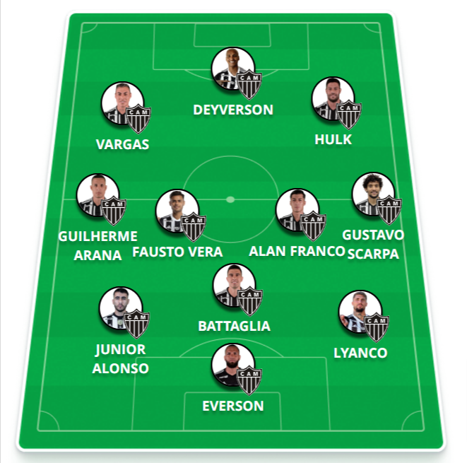 Provável escalação do Atlético-MG: Everson; Lyanco, Battaglia, Junior Alonso e Guilherme Arana; Fausto Vera, Alan Franco e Gustavo Scarpa; Vargas, Hulk e Deyverson.