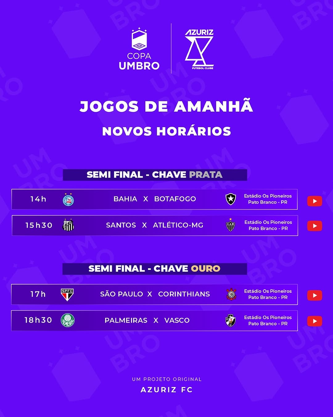 Novos horários para os jogos das semi-finais da Chave Ouro e Chave Prata da Copa Umbro 2024. Partidas foram adiantadas em 1 hora.
