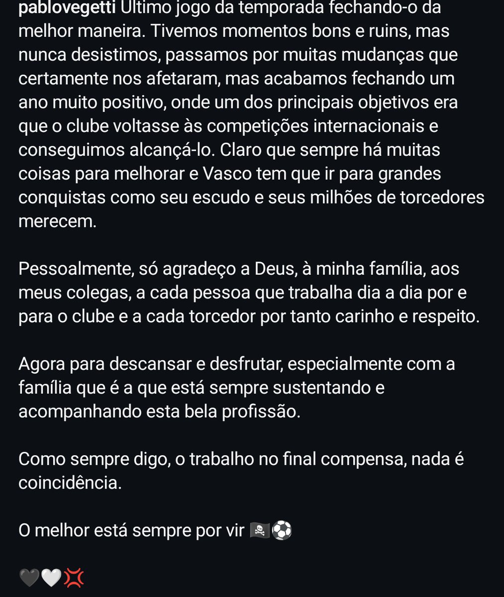 "Tivemos momentos bons e ruins, mas nunca desistimos. Acabamos fechando um ano muito positivo, onde um dos principais objetivos era que o clube voltasse às competições internacionais e conseguimos alcançá-lo."