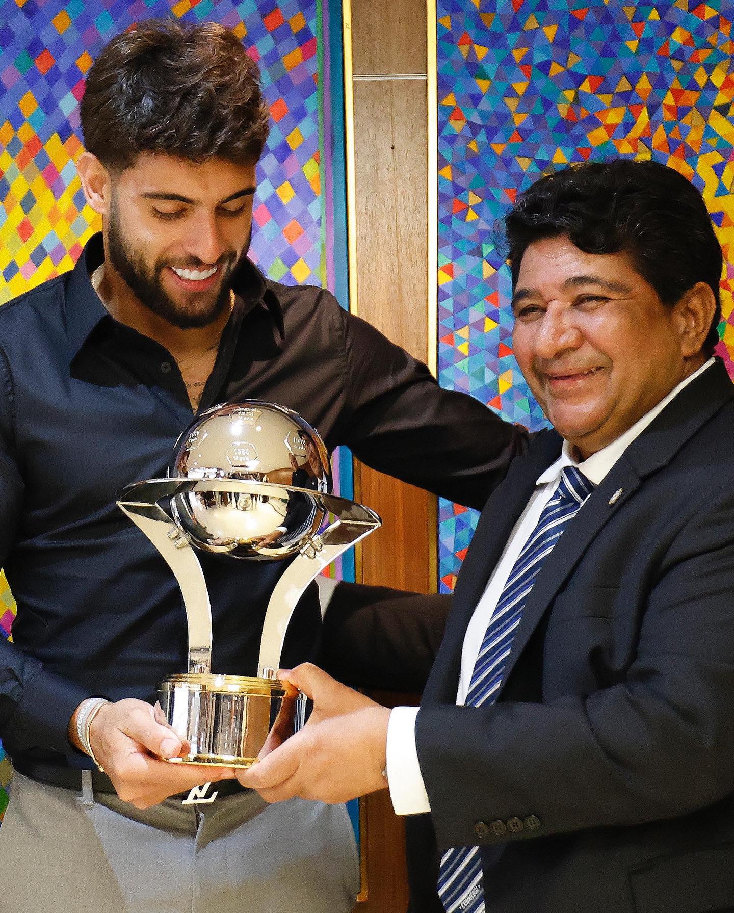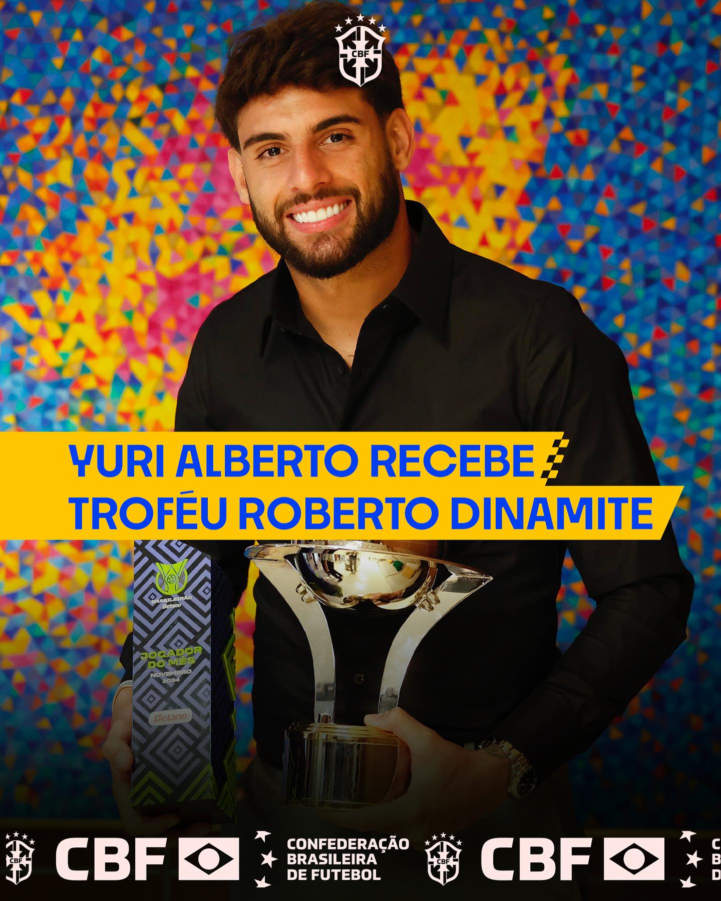 Yuri Alberto recebeu na tarde desta quinta-feira (12), na sede da CBF, no Rio de Janeiro, o Troféu Roberto Dinamite, que premia o artilheiro do Brasileirão Betano 2024. Acompanhado de familiares, o autor de 15 gols na Série A do Campeonato Brasileiro ganhou a honraria do presidente da CBF, Ednaldo Rodrigues