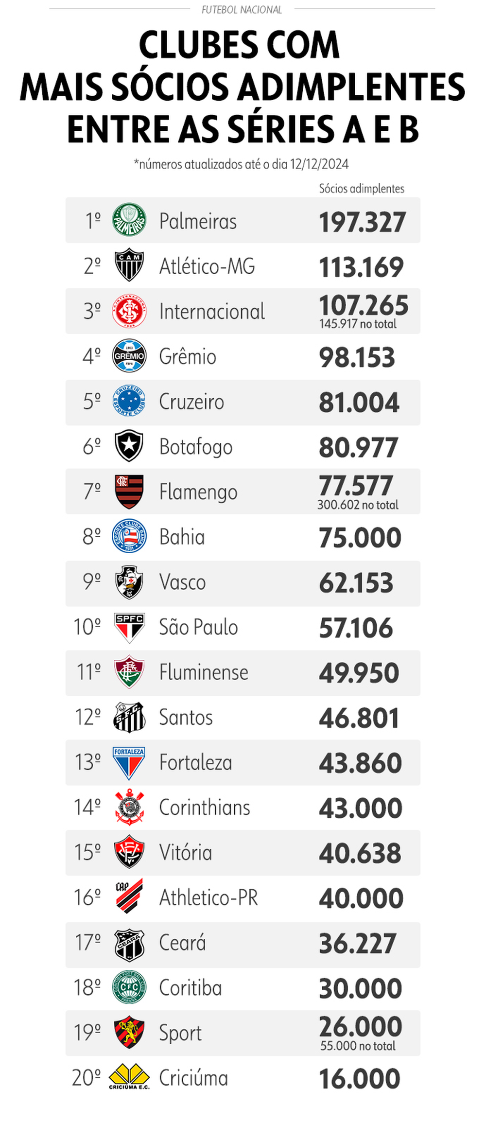 *O ge procurou Athletico e Corinthians, mas não obteve os números atualizados. Por isso, os dados deste ranking são os publicados no dia 20 de março.** O ge procurou Guarani, Mirassol e Novorizontino, mas não obteve os números atualizados. Por isso, os dados deste ranking são os publicados no dia 1º de julho.*** Número aproximado**** O Sport conta com uma base de 55 mil sócios ativos incluindo os dependentes