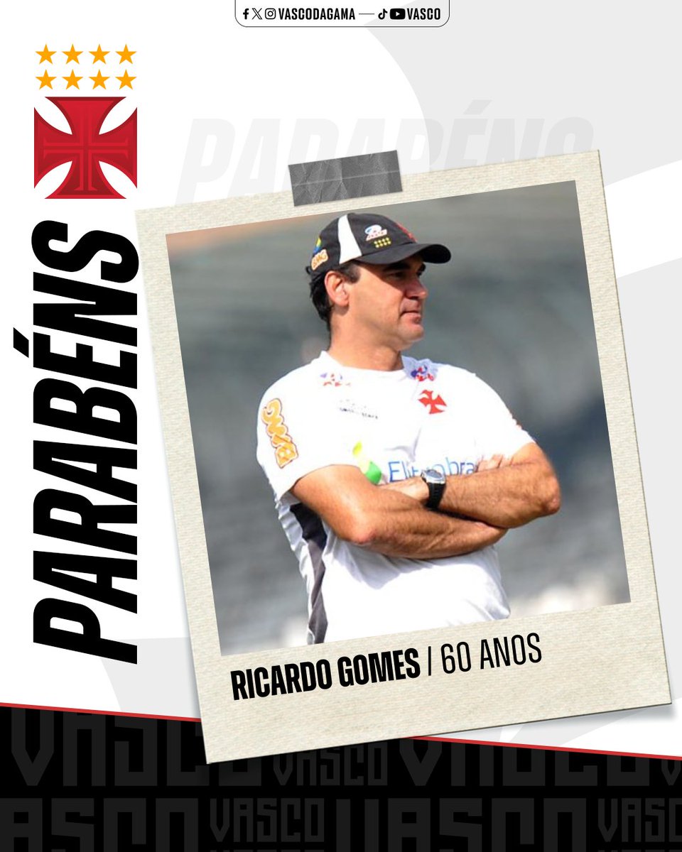 Vasco parabeniza Ricardo Gomes, aniversariante do dia: 'Parabéns ao comandante do título da Copa do Brasil de 2011'