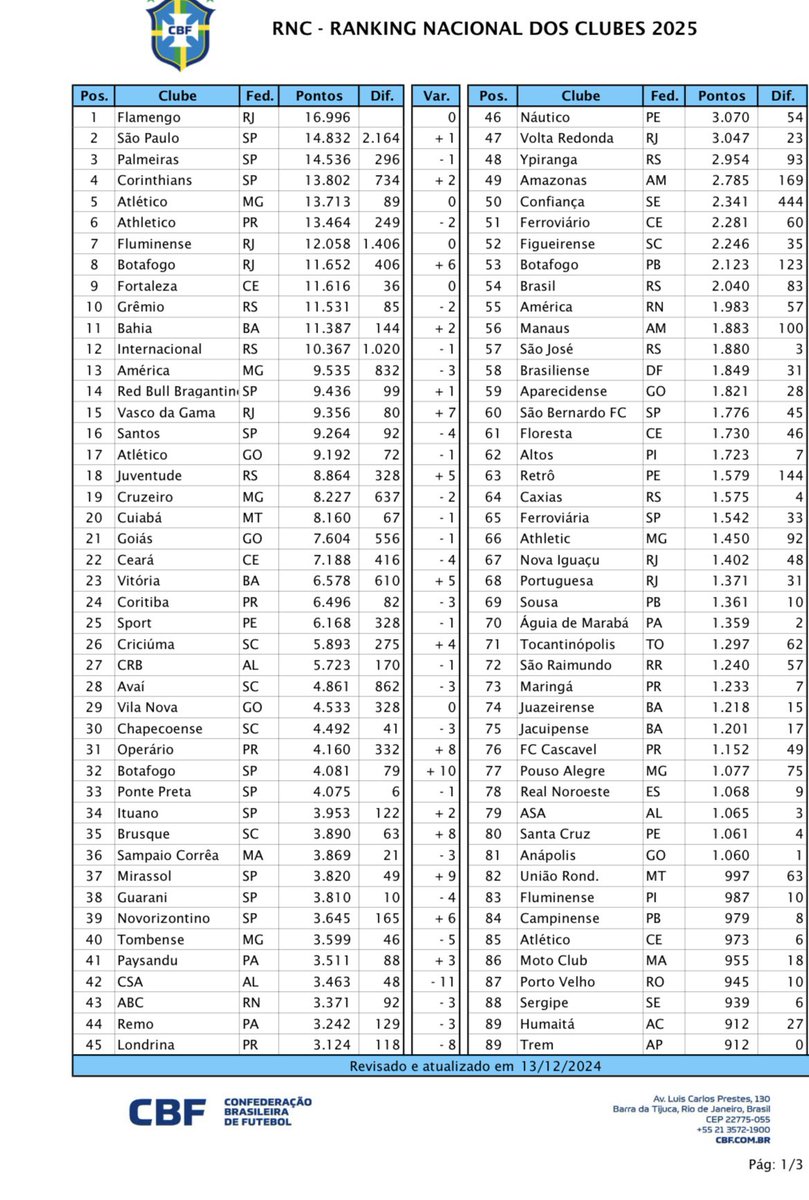 Atenção! A CBF divulgou o ranking nacional dos clubes atualizado e em 2025 nós teremos 2 trocas nos clubes que disputam o Campeonato Brasileiro sub-17 e sub-20: entram Vasco e Juventude nos lugares de Goiás e Ceará.