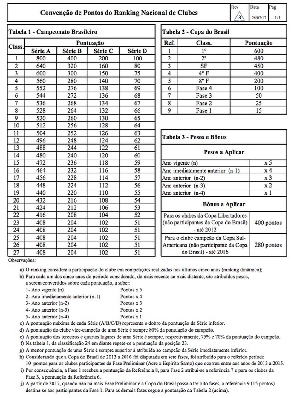 Os atuais critérios passaram a ser adotados a partir do ranking de 2013. A pontuação é estabelecida a partir de um cálculo sobre o desempenho dos clubes nas competições nacionais realizadas nos últimos cinco anos. Para cada ano, são atribuídos pesos a serem convertidos em pontuação, com as competições mais recentes tendo valor maior.