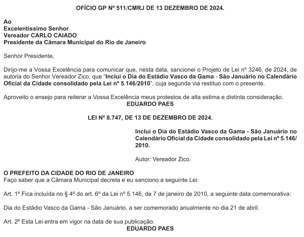 Prefeito Eduardo Paes sanciona lei que define 21 de abril como Dia do Estádio Vasco da Gama - São Januário
