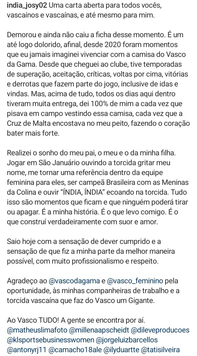 ✉ | Após anúncio do Vasco, Índia publica carta aberta em seu Instagram.