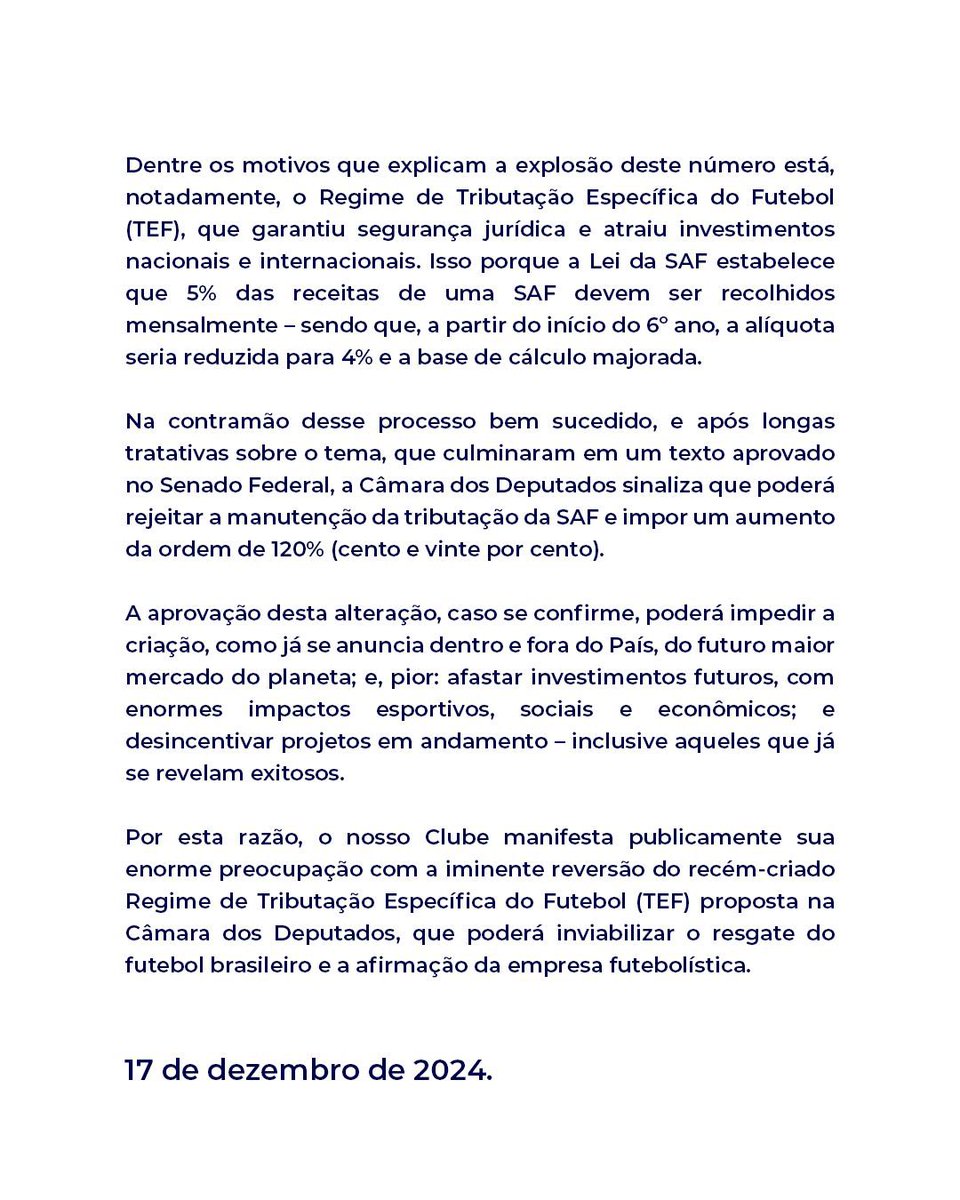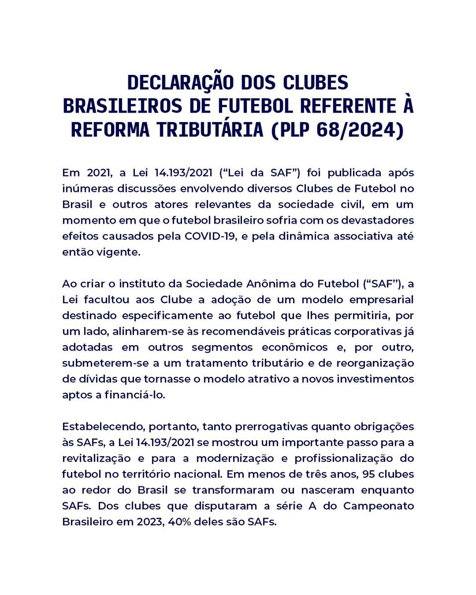 Declaração dos clubes brasileiros de futebol referente à Reforma Tributária (PLP 68/2024).