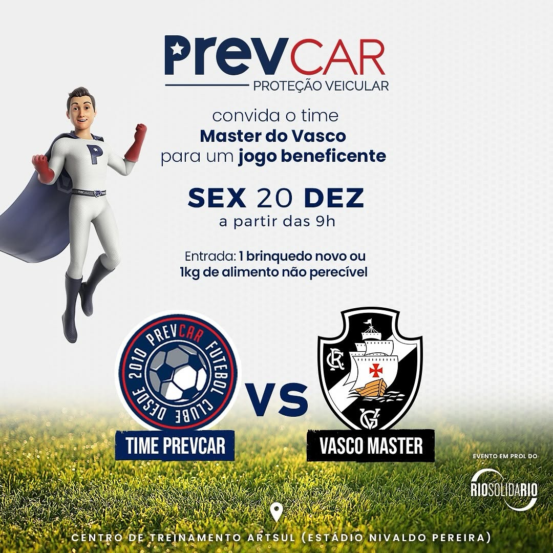 De um lado o📍 Vasco Master com Donizete Pantera, Mauro Galvão, Luisinho, entre outros craques 🆚 e do outro a turma que sabe como proteger o seu veículo contra roubo, furto, colisão e garante 24h de assistência! PrevCar Auto.