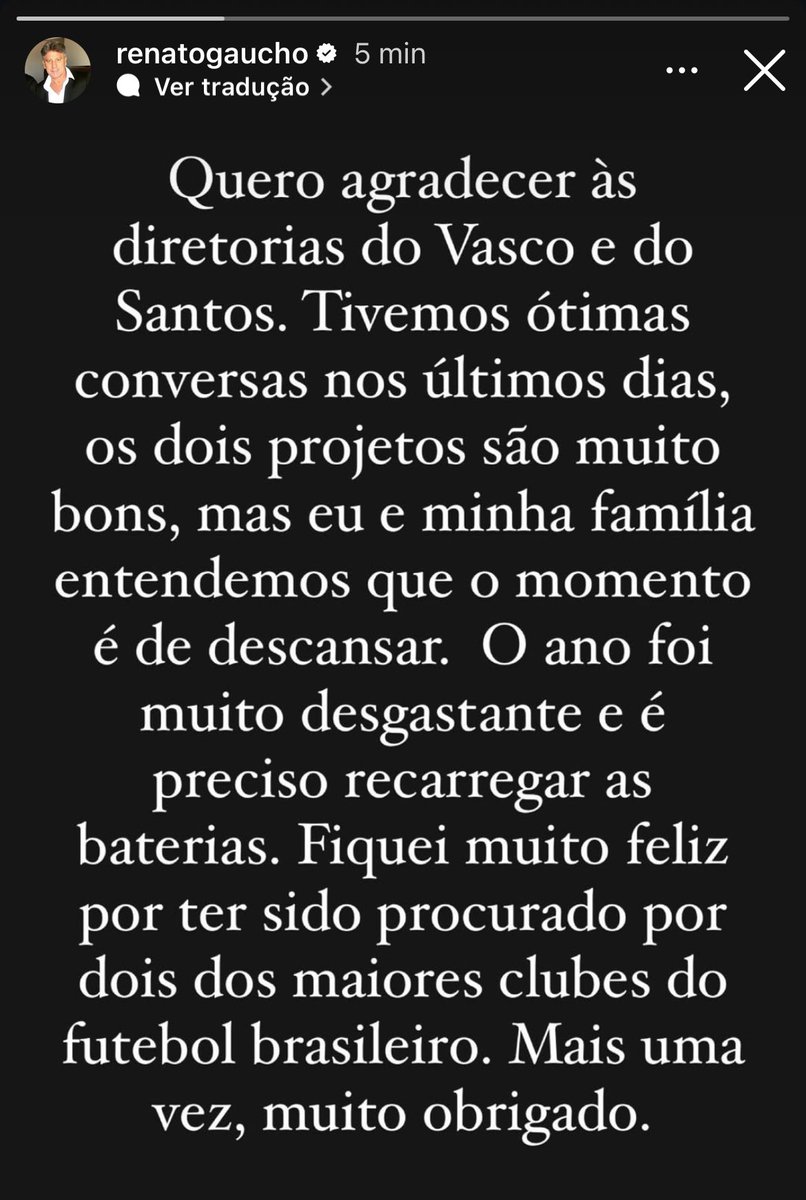 - Quero agradecer às diretorias do Vasco e do Santos. Tivemos ótimas conversas nos últimos dias, os dois projetos são muito bons, mas eu e minha família entendemos que o momento é de descansar. O ano foi muito desgastante e é preciso recarregar as baterias. Fiquei muito feliz por ter sido procurado por dois dos maiores clubes do futebol brasileiro. Mais uma vez, muito obrigado - disse Renato Gaúcho.