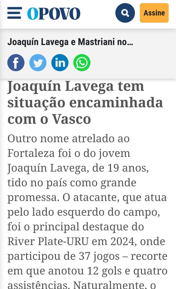 Segundo a apuração do @opovo o @FortalezaEC não procurou o atleta Joaquín Lavega do River Plate. O que o Vasco está próximo de firmar um acordo com o atleta.