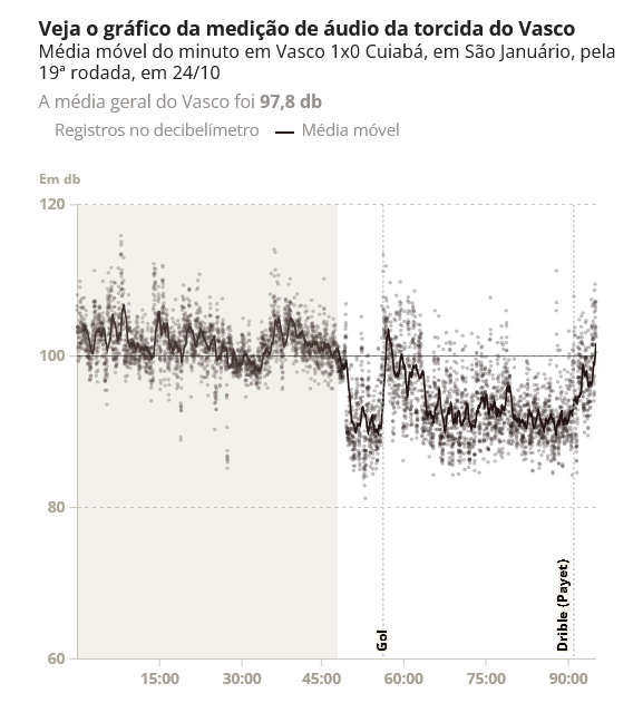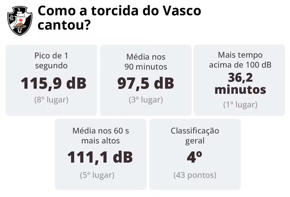 Ao todo, os cruz-maltinos ficaram em mais de um terço do tempo de bola rolando, 36 minutos e 15 segundos, acima da marca de 100dB. Graças a essa constância, o Vasco foi o líder da métrica de 'Qual torcida cantou alto por mais tempo'.