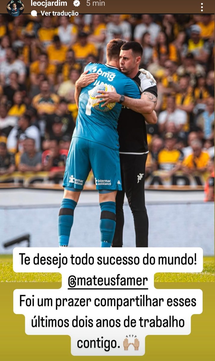 Léo Jardim se despediu do preparador de goleiros Mateus Famer que deixou o Vasco e acertou com o Grêmio.