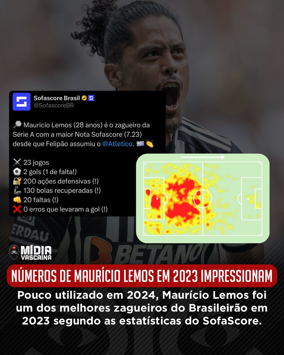 💢⚽️📊 Números @SofascoreBR do zagueiro Maurício Lemos pelo Galo no Brasileirão de 2023.