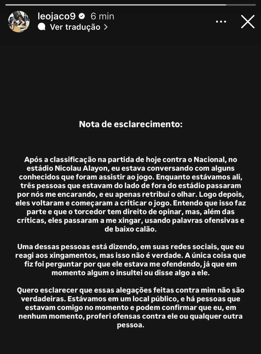 O atacante Léo Jacó, do sub-20, divulgou um comunicado após ser acusado de xingar a torcida na partida contra o Nacional nesta sexta-feira (10).