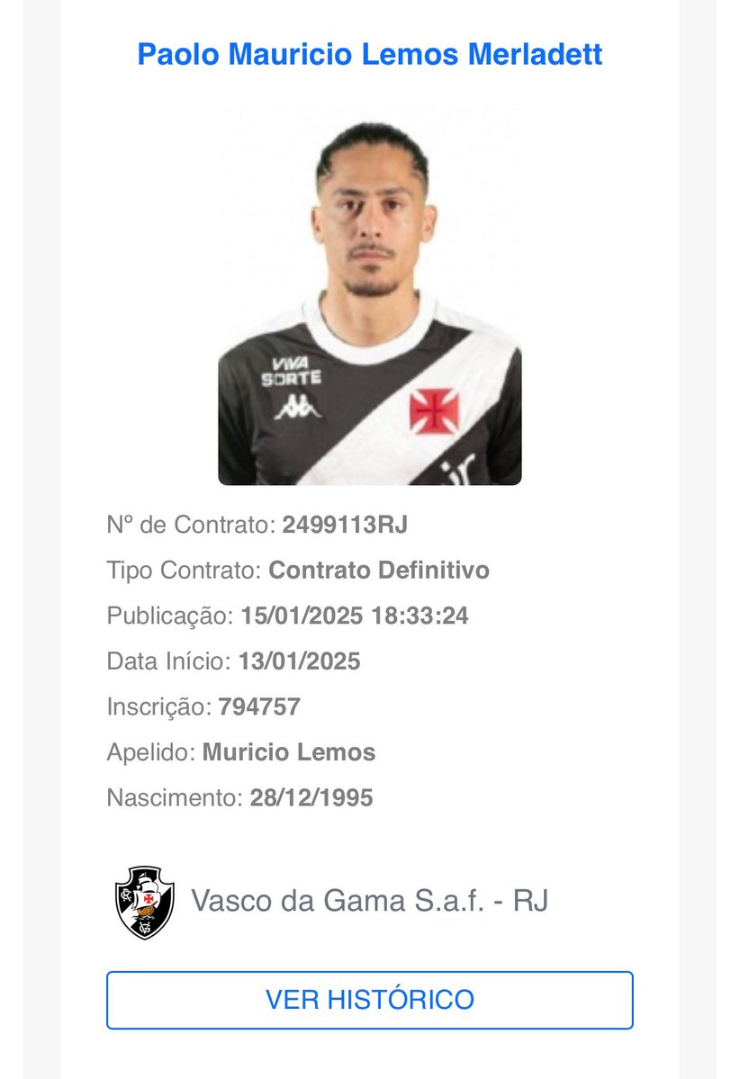 Zagueiro Maurício Lemos já está no Bid da CBF e regularizado para atuar pelo Vasco.