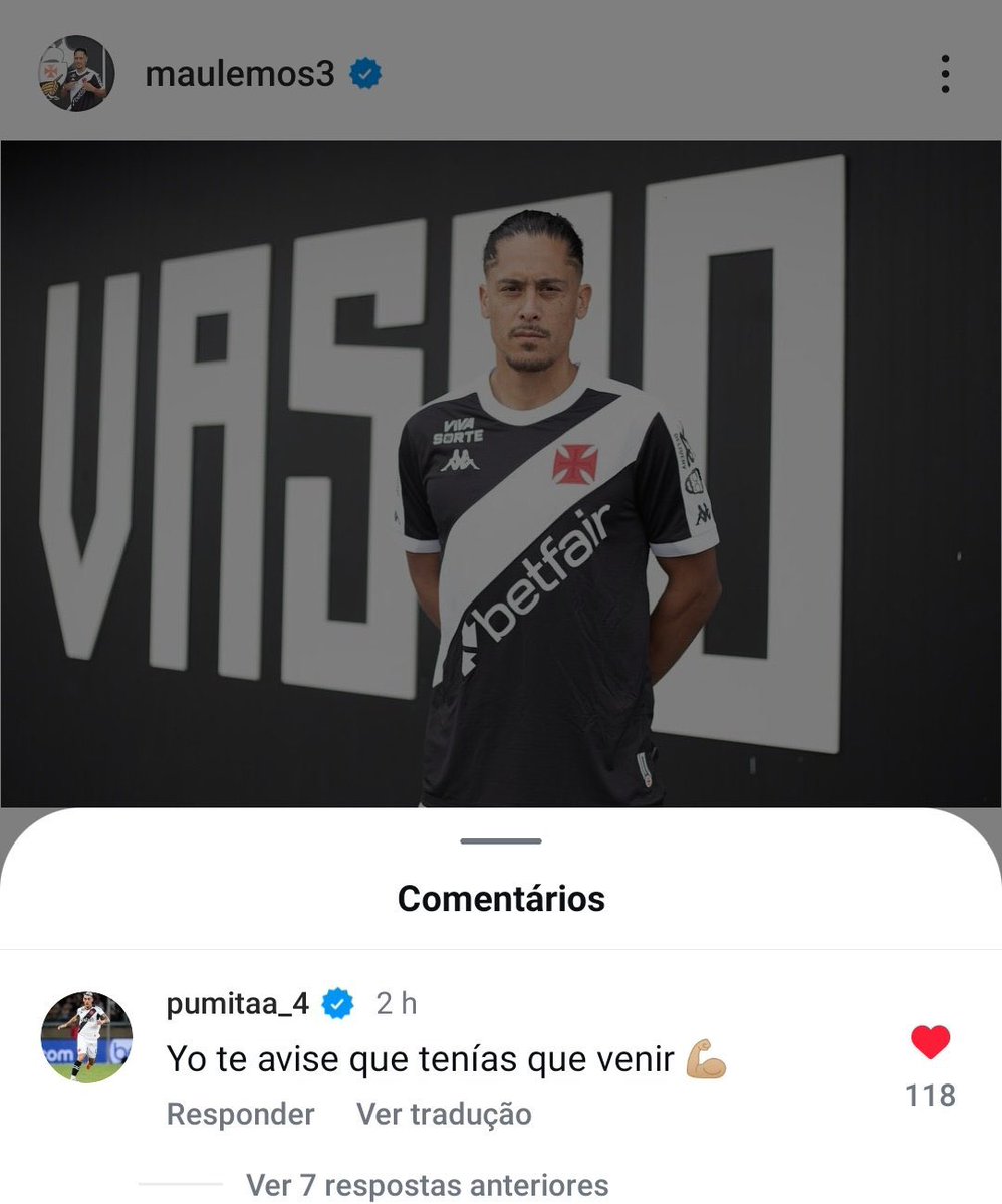Puma Rodríguez comenta em foto de Mauricio Lemos com a camisa do Vasco: 'Eu te avisei que tinhas que vir'