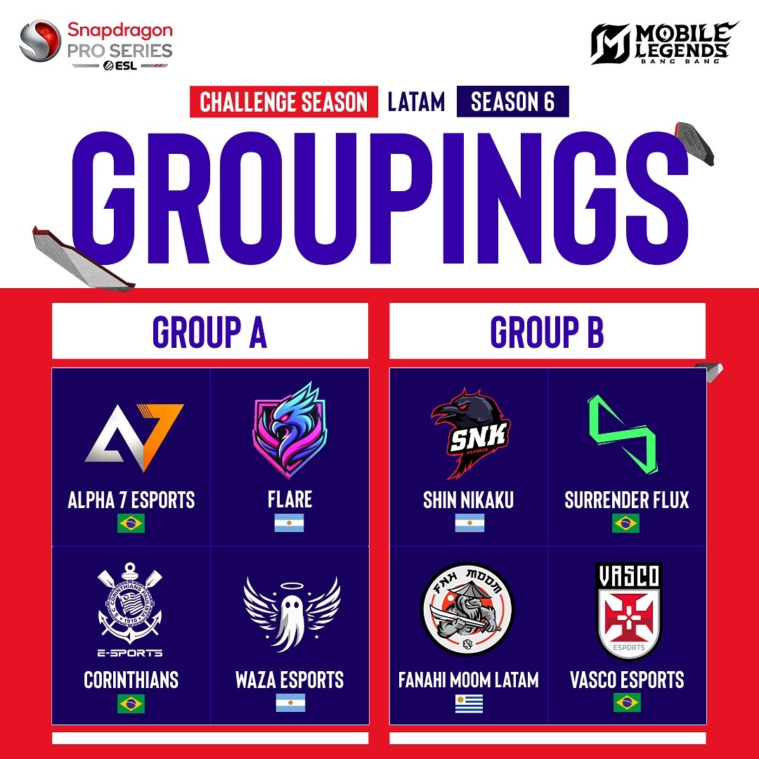 GROUPINGS REVEALED! Which teams are about to clash in the #Snapdragon Mobile Challenge Season for Mobile Legends: Bang Bang Season 6 #LATAM region? 💪 Find out now!