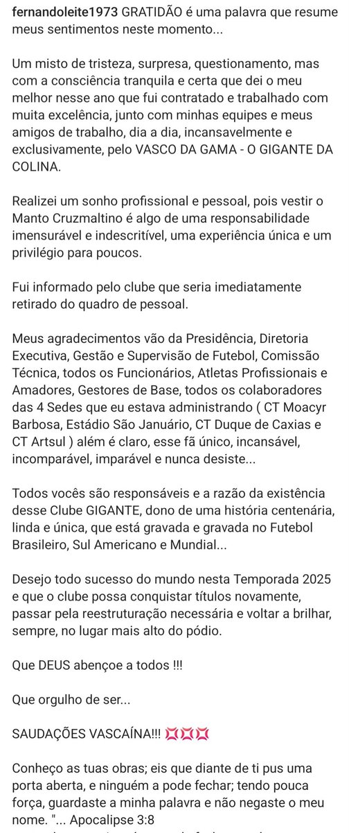 A diretoria do Vasco demitiu o Gerente Administrativo de Sedes, Fernando Leite. O profissional chegou ao clube em janeiro de 2024. Vinha trabalhando na melhoria, principalmente, dos gramados do CT e de São Januário. Fernando foi pego de surpresa com a decisão, pois não houve uma justificativa para o desligamento.