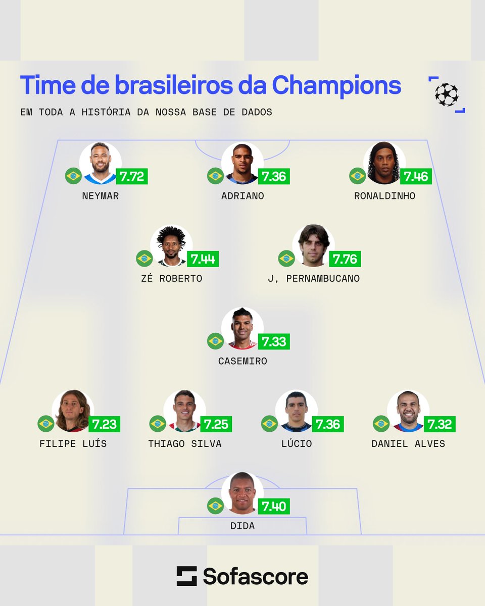 Montamos a escalação com as maiores Notas Sofascore entre os brasileiros na Champions League desde a temporada 2003/04! 🇧🇷🔥